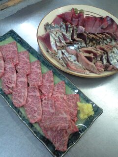 気を付けョ~今日のまかない肉のたまやさんシリーズ特選牛の牛刺しと夕方に一本釣りで釣ったカツオ