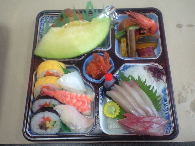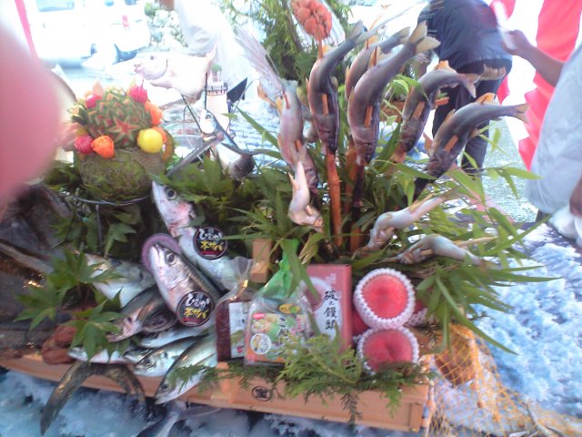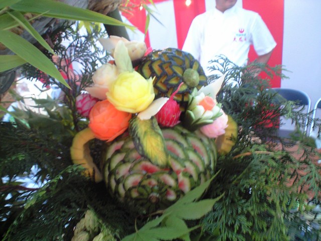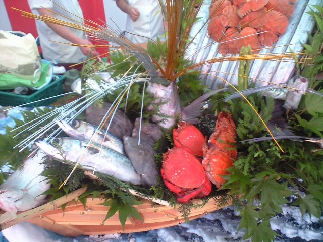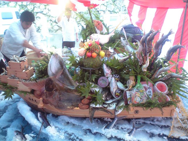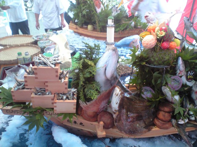 そこでは、大分県宮崎県の、それぞれの特産品を船盛りにするイベントがありました。左の写真は宮崎県側です。県ブランドの、ひむか本鯖、灘鯵、宮崎カンパチを盛り込み、特産品の北方の桃、北川の鮎、延岡のやぶれ饅頭などいろいろな物を盛り込みました。