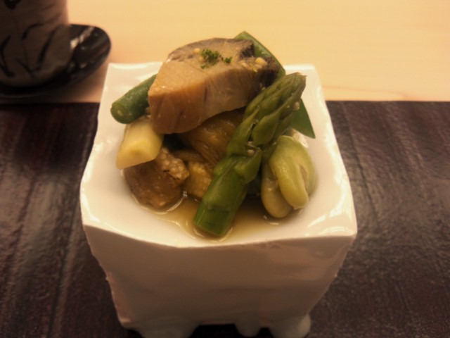 次は、柔らかく蒸した鮑と夏野菜のお浸しです。(焼なす、アスパラ、インゲン、ヤングコーン、オクラ、そら豆)