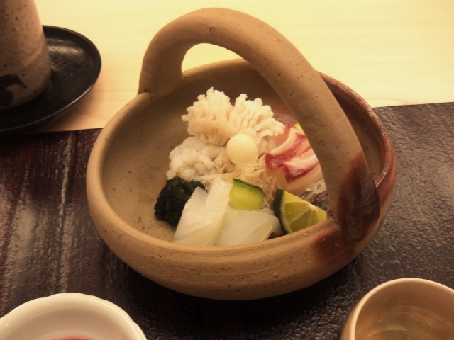 お造り、あおりイカ、真鯛、鱧ちりです。