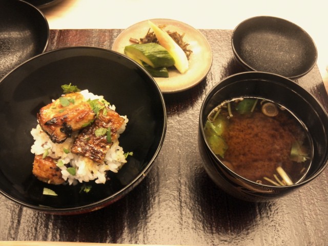 ご飯、天然大鰻のうな丼と赤出汁です。